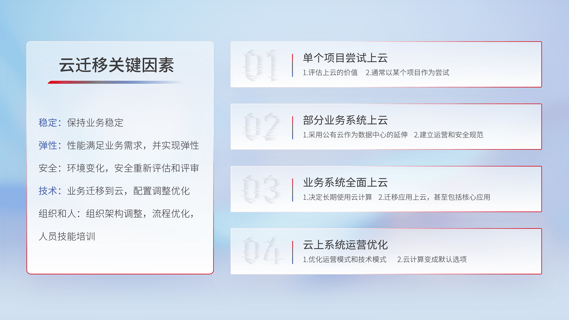 结合实际业务,,从规划设计、、、、云平台选型、、、、云原生改造、、、数据迁移、、、、集成交付,,,迁移全过程为客户识别最佳上云路径,,做好风险识别管理,,设计网络架构、、身份权限、、、、安全审计合规、、、、操作审计、、、、日志审计、、、监控告警策略、、、多站点容灾设计等,,对云上基础设施进行整体规划,,提升IT治理水平,,以满足弹性、、高可用、、高性能的需求。。。。