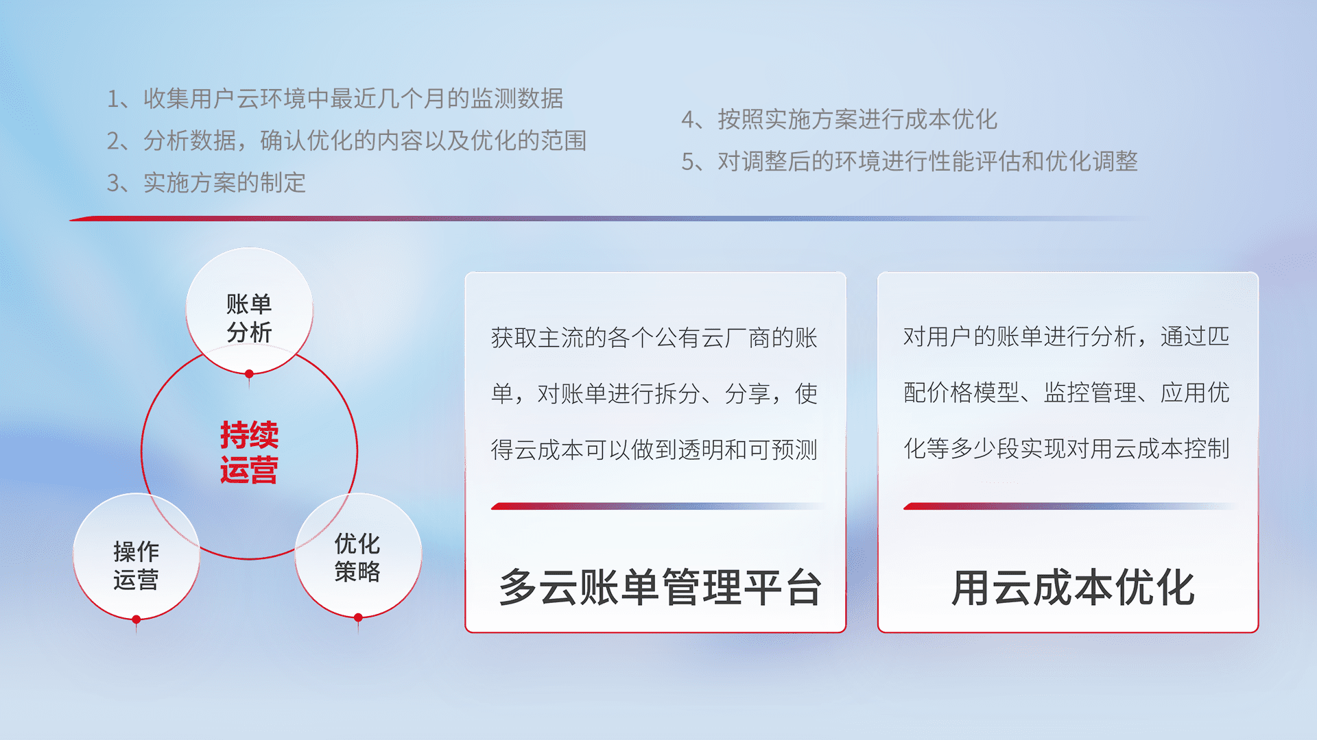 通过多云纳管,,,以统一的资源数据模型把客户的云资源进行抽象和封装,,,进而实现对多云资源的统一操作,,保障云资源管理的可靠性、、稳定性与可用性。。。量身定制化运维内容,,,,配置、、开发运维、、补丁管理、、、、备份、、、、监控、、、认证和访问管理、、审计和日常巡检等,,,保障在用云过程中的可靠度,,,,稳定度以及高可用率。。。。